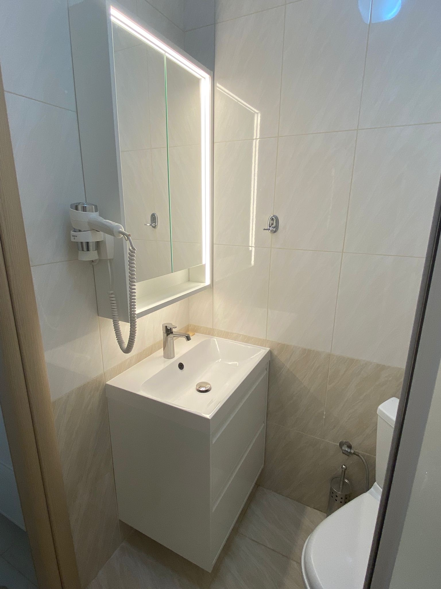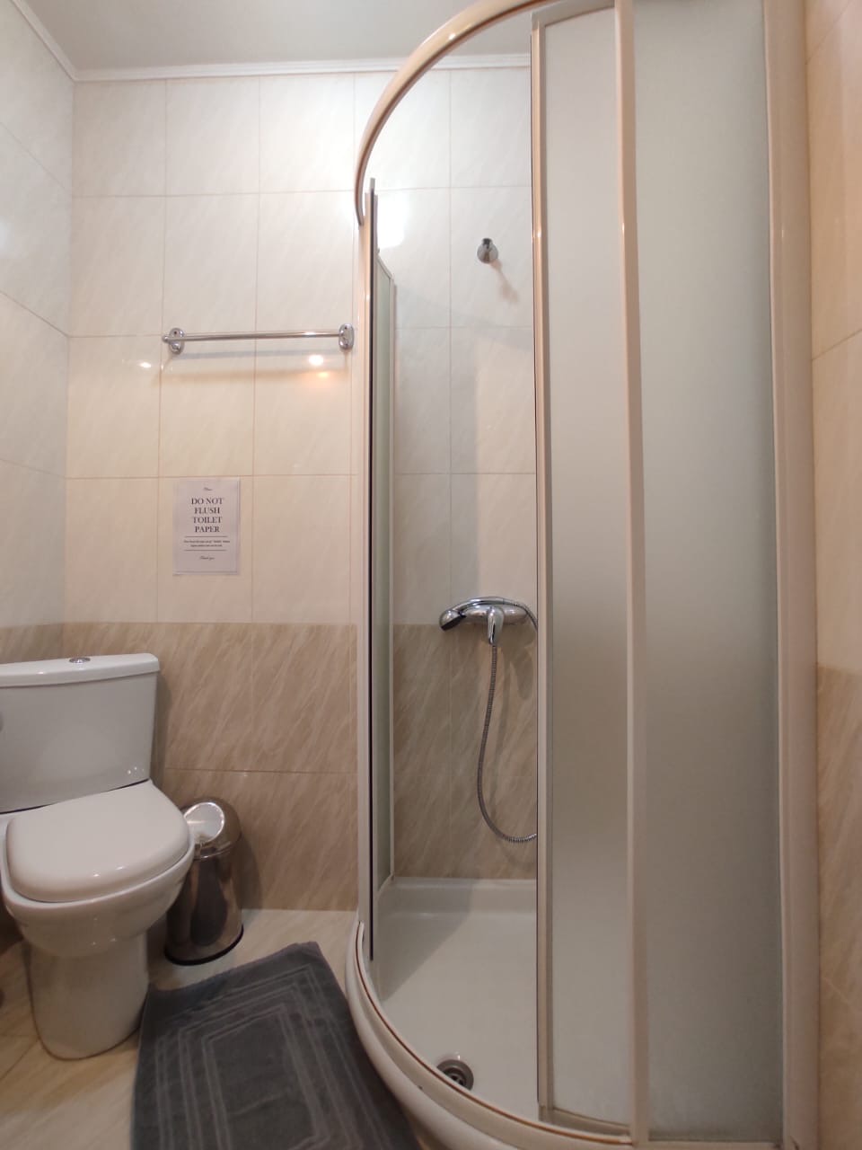 ein Bad mit Dusche und WC. Alle Räume sind klimatisiert.