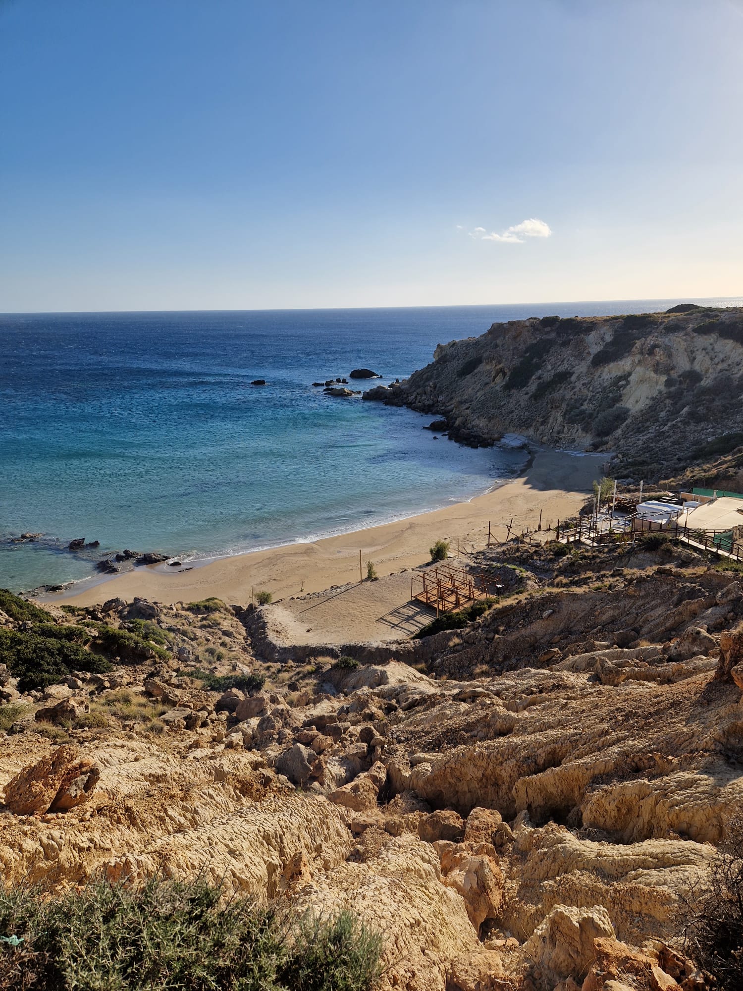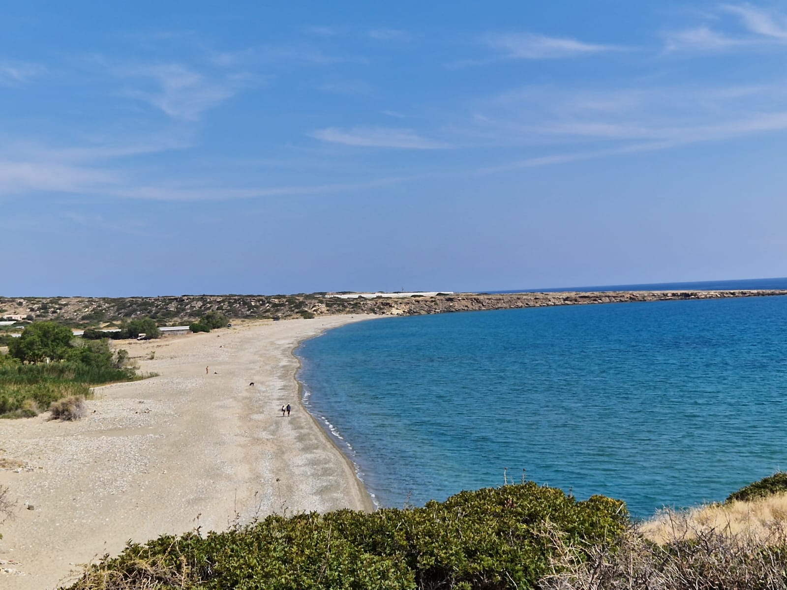 Der „blue flag“ Strand ist nicht sehr breit, aber zeichnet sich beginnend beim Parkplatz durch feinen Sand aus. Es „geht“ sehr flach in’s Wasser, sodass der Strand gut für Kinder geeignet ist. Zusätzlich können dort im Sommer Liegen und Sonnenschirme gemietet werden. Die nächste Bar oder Taverne ist nie mehr als 50 Meter entfernt.