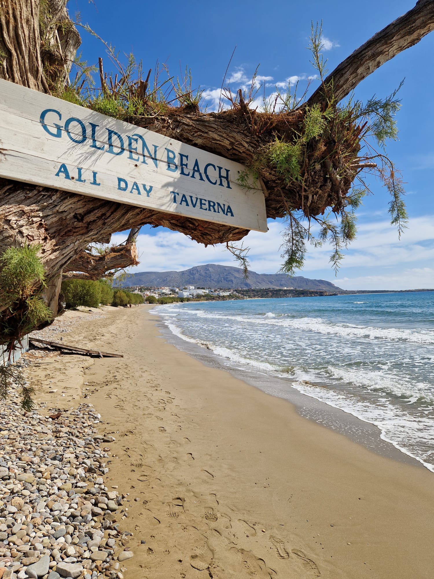 Man fährt mit dem Auto zum Hauptparkplatz von Makry-Gialos um dort kostenlos zu parken und dann in Richtung Osten zu gehen. Dort weist das Schild „Golden Beach – all day Taverna“ auf den Beginn des Strandes hin.