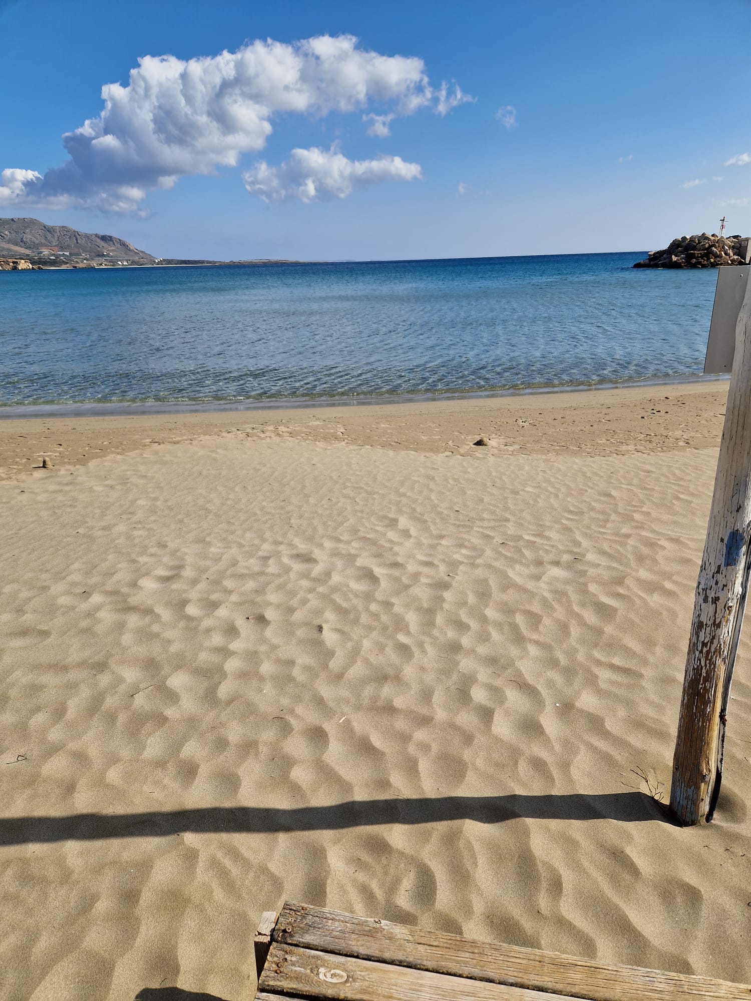 Es geht sehr flach in’s Wasser, sodass der Strand gut für Kinder geeignet ist. Zusätzlich können dort im Sommer Liegen und Sonnenschirme gemietet werden. Oder man setzt sich überhaupt in eine der Bars oder Tavernen und schaut dem Treiben am Strand zu.