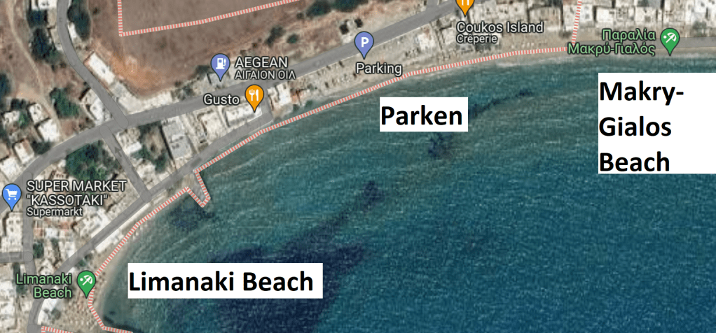 Der einfachste Weg ist mit dem Auto bis zum Hauptparkplatz von Makry-Gialos zu fahren, dort kostenlos zu parken und dann in Richtung Westen zu gehen. Nach wenigen Metern (ca. 5 Min.) auf der Promenade kommt man direkt zum Strand.